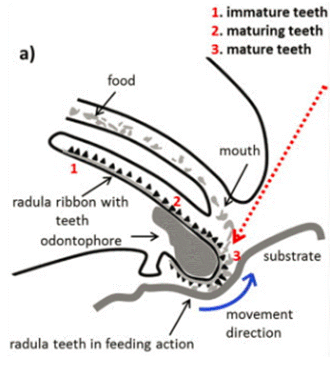 This wonderful displacement system operates in a similar way to the movement mechanism on a conveyor belt where the teeth begin to grow primarily in the posterior part of the radula. Meanwhile, they are strengthened and matured by iron mineralization. When this mineralization is complete, they are moved towards the front of the radula. In this way, completely matured teeth are permanently retained at the far-front scraping area. During the scraping process, the matured teeth wear out at a rate equal to the growth rate. In the meantime, a new set of teeth begins to grow. By means of this magnificent cycle, new teeth are constantly created and matured so that there are no disruptions in nutrition.